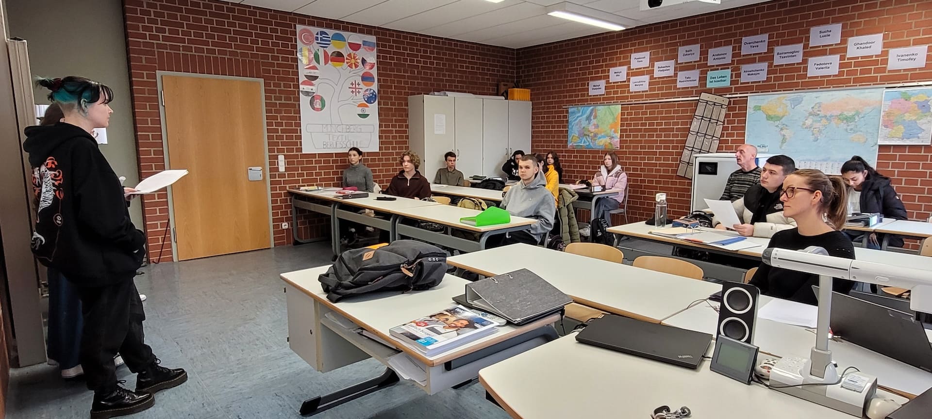 Vier junge Schülerinnen der Klasse Modeschneiderinnen stellten sich den Fragen unserer Schülerinnen und Schüler der Berufsintegrationsklasse. Herr Hitze übernahm die Vorstellung der Klassen und moderierte das Gespräch. Kurzweilig und interessant wurden hier viele Informationen über Ausbildung, Mode, Arbeitsleben usw. ausgetauscht.