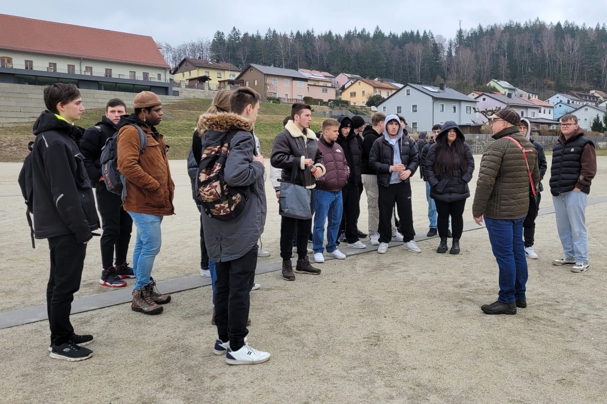 Nach der Anreise mit zwei Reisebussen kamen wir wieder Vormittags kurz vor 10 Uhr an und in Kleingruppen wurden unsere Schülerinnen und Schüler über das Gelände geführt. Für unsere Berufsintegrationsklassen hat die Gedenkstätte eine besondere Führung in leichterer Sprache, z.T. in Englisch angeboten. Man merkt sehr schnell, das Interesse der einzelnen jungen Menschen und das Unverständnis, was hier vor Ort geschehen ist. Die Einzelgespräche werden schnell weniger, die Handys verschwinden oder werden nur noch für Fotos verwendet und die Fragen gehen immer mehr in die Tiefe. Nach gut zwei Stunden Rundgang hatten dann alle Schülerinnen und Schüler noch Zeit, selbstständig das Gelände zu erkunden, eine der Dauerausstellungen zu besuchen oder Mittag zu essen. Manche nutzen die Zeit auch, um die schöne Burgruine Flossenbürg schnell noch zu erklimmen, bevor es mit Bussen zurück nach Münchberg ging.