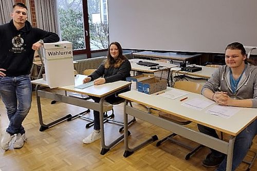 Simuliert wurde die Wahl zum Dt. Bundestag 2025 mit Wahlbenachrichtigungen, Wahlkabinen, verplombter Wahlurne und dem Wahlvorstand (Elias, Tyra und Severin) aus der Seilerklasse 12. Unterstützt haben die Lehrkräfte Hr. Seidl, Hr. Hitze und Fr. Öxler.