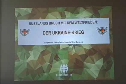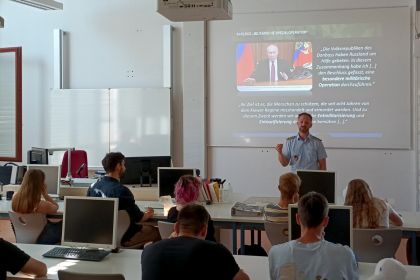 Die Schülerinnen und Schüler erhielten mit Hilfe von unterschiedlichen Impressionen Einblicke in die derzeitige Situation und einen grundlegenden Überblick über das Kriegsgeschehen. Dabei wurden schülernah die Hintergründe für das politische und kriegerische Handeln Russlands und dessen Präsidenten in der Ukraine aufgezeigt.