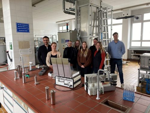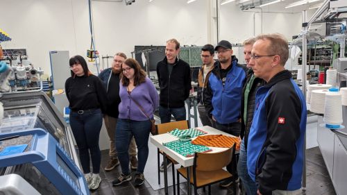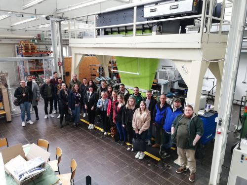 Die Teilnehmergruppe konnte an einem Nachmittag in den Technikräumen direkt an den Produktionsmaschinen die Praxis der Textilfertigung und Ausrüstung „live“ erleben.