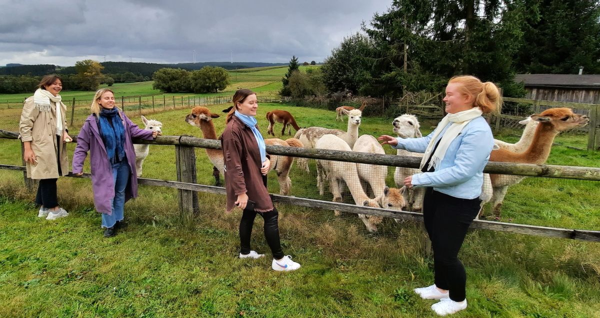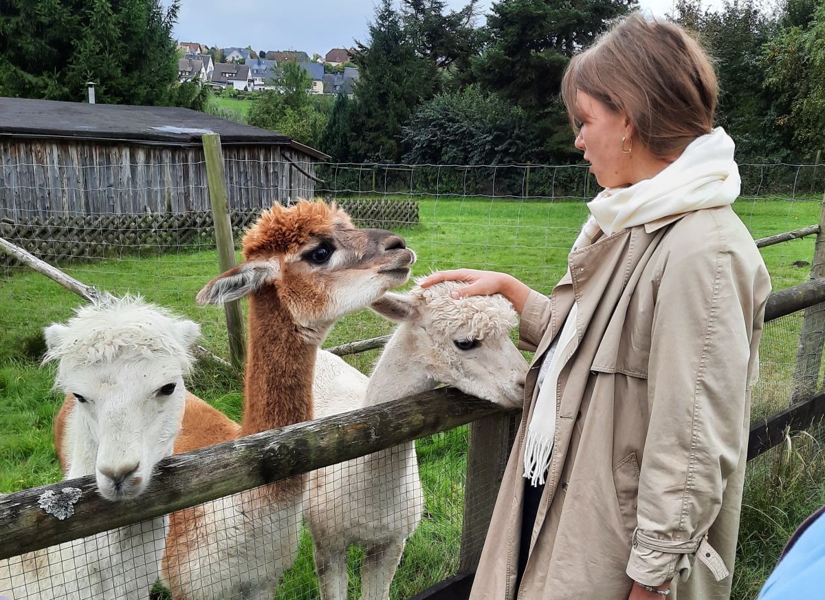 Zum Abschluss der Exkursion besuchten wir noch Alpakas auf der Weide, um auch hier noch einmal Wolle hautnah zu erleben.