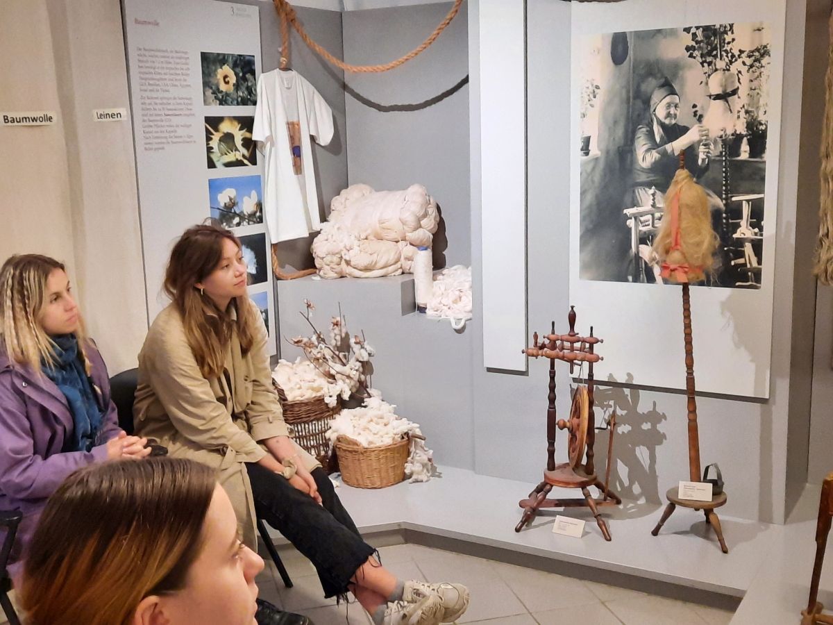 Leinen, Wolle, Baumwolle oder Chemiefasern? Frau Ölschlegel vom Textilmuseum Helmbrechts veranschaulichte uns die Entstehungsprozesse von verschiedenen Textilfasern, das Hauptaugenmerk lag dabei auf Leinen. Die Schülerinnen probierten begeistert die alten Techniken an Originalwerkzeugen aus.