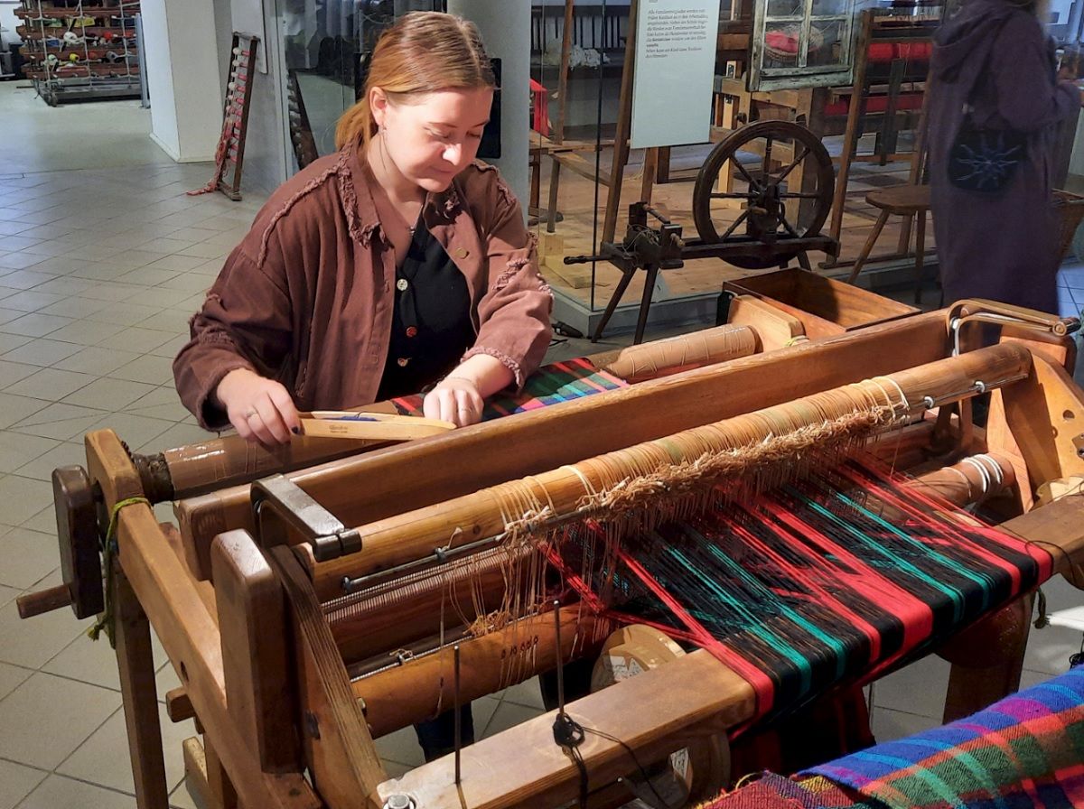 Erstaunen erweckte die Weberstube, in der früher auf engstem Raum gearbeitet und gelebt wurde. Auch ließen wir es uns nicht nehmen, einen Zentimeter an einem alten Handwebstuhl am längsten Schal der Welt zu weben.