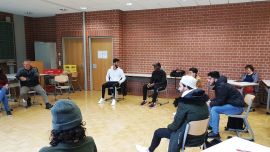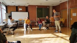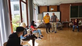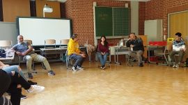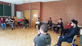 In einem zweiten Abschnitt spielten die Mitarbeitenden des Teams kleine Rollenspiele, in denen es zunächst um das Verhältnis Vater-Sohn in einer patriachal geprägten Familie ging. Streng und laut wurde hier der Sohn vom Vater niedergemacht und beschimpft, weil er immer nur spiele und es im Leben zu nichts bringe und dass er sich in der Moschee vor seinen Freunden für seinen Sohn schämen würde. Im Anschluss kam es zu einer Diskussion über das Gesehene und die jungen Erwachsenen waren sich eigentlich einig, dass so etwas normal sei, dass der Vater so mit dem Sohn rede, aber es eigentlich nicht gut sei. In der lebhaften Diskussion, in der die Referenten die Schülerinnen und die Schüler zum Teil sehr direkt und provokativ ansprachen, wurden diese motiviert, aktiv mitzumachen und dabei zu zeigen, wie es besser wäre. Es wurden Punkte angesprochen, wie z.B. „Warum spielt der Sohn dauernd?“, „Was macht der Vater falsch?“ „Hat der Sohn Angst oder Respekt?“.