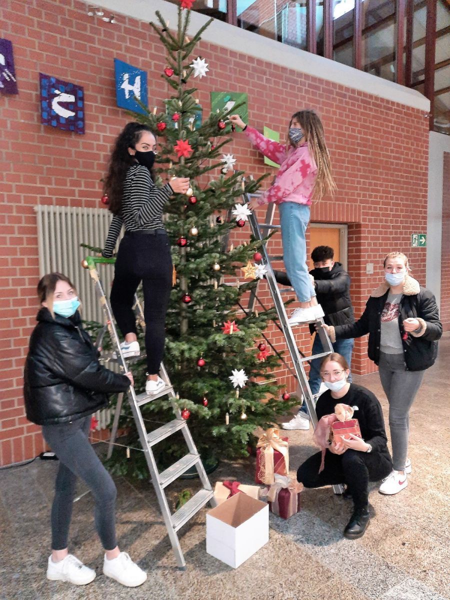 Schüler und Schülerinnen der Klasse Textil- u. Modeschneider 2020/21 setzten mit dem Schmücken des Weihnachtsbaumes wieder kreative Akzente.