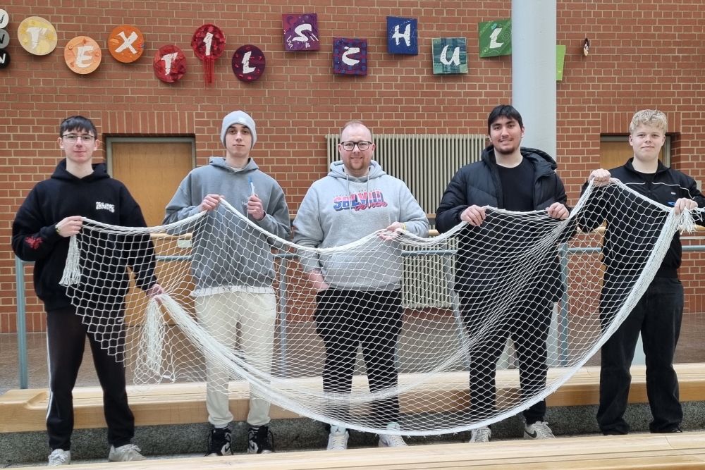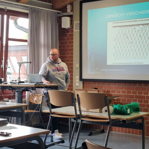 „Zurück zum Anfang" hieß es für den ehemaligen Seiler-Absolventen der Textilberufsschule Münchberg Nico Dehne. Für einen Lehrgang zum Reparieren und Zuschneiden von Netzen für die Schüler der TSE12 kam er zurück nach Münchberg im Namen der Firma Engel-Netze.