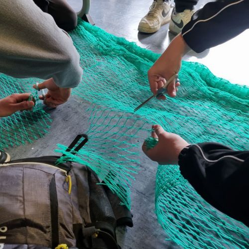 Hierbei lernten die Schüler das Flicken kaputter Netze und wie man diese korrekt zuschneidet. Somit konnten Sie ihr bereits erlerntes Wissen einmal ausführlich in der Praxis unter Beweis stellen.