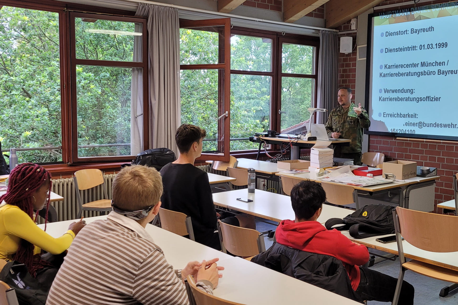 Ein Hauptmann der Bundeswehr besucht die Berufsintegrationsklassen und gibt den Schülerinnen und Schülern die Möglichkeit, die Bundeswehr kennenzulernen.
